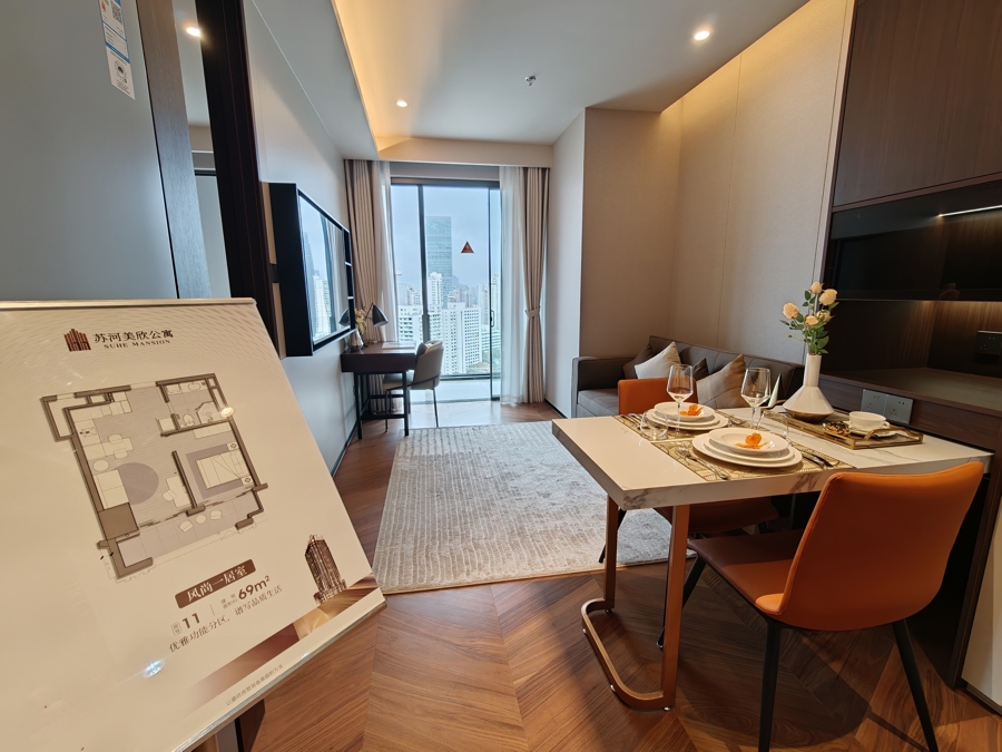 苏河美欣公寓位于人民广场附近的苏州河畔,红砖、陶板幕墙和玻璃幕墙组成的古典三段式外立面大气磅礴,端庄典雅。步入里面,苏河美欣公寓的空间规划承载着多元生活需求:地下两层可停车;地上1至5层融合着商业配套、健身房与办公辅助空间;6至22层的230套公寓中,不但有标准客房,也有一居或两居大户型公寓;23层为休闲画廊。
