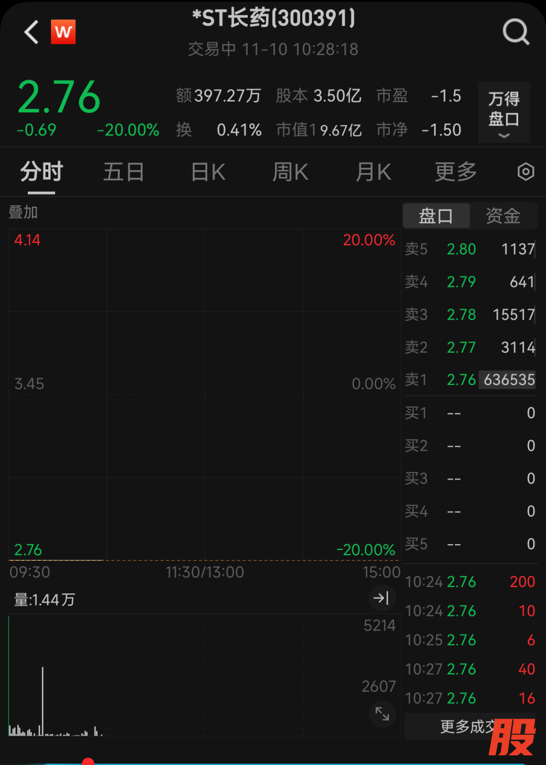 10日,*ST长药(300391)股价开盘即“20CM”跌停。截至发稿,卖一位置仍有63万手卖单在排队。