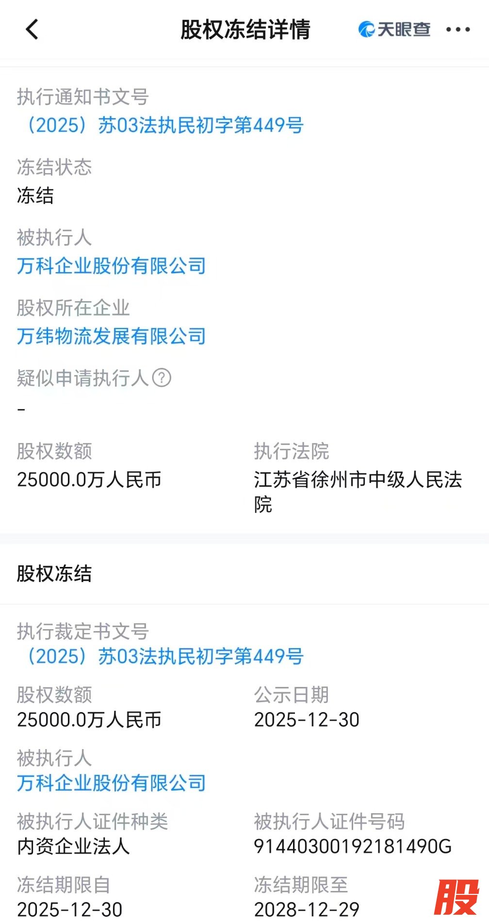 1月4日,界面新闻从天眼查APP获悉,日前万科企业股份有限公司(简称万科)新增一则股权冻结信息,股权所在企业为万纬物流发展有限公司,冻结股权数额2.5亿元人民币,冻结期限为3年,执行法院为江苏省徐州市中级人民法院。